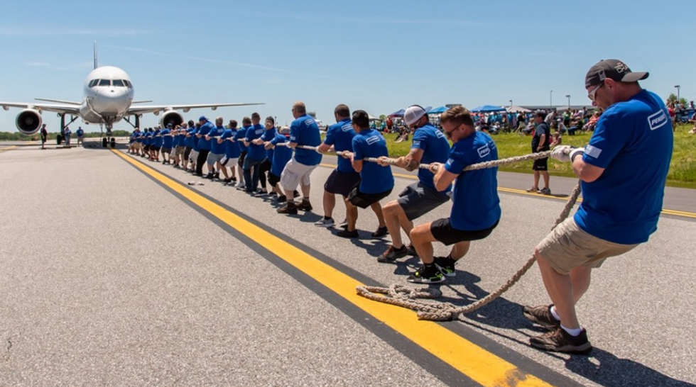 Held June 8 at the Portland International Jetport, Portland, Maine, the plane pull featured corporate-sponsored teams pulling a Boeing 757. The plane weighed 80 tons, which equals to roughly 6,400 pounds of weight being pulled by each team member.
